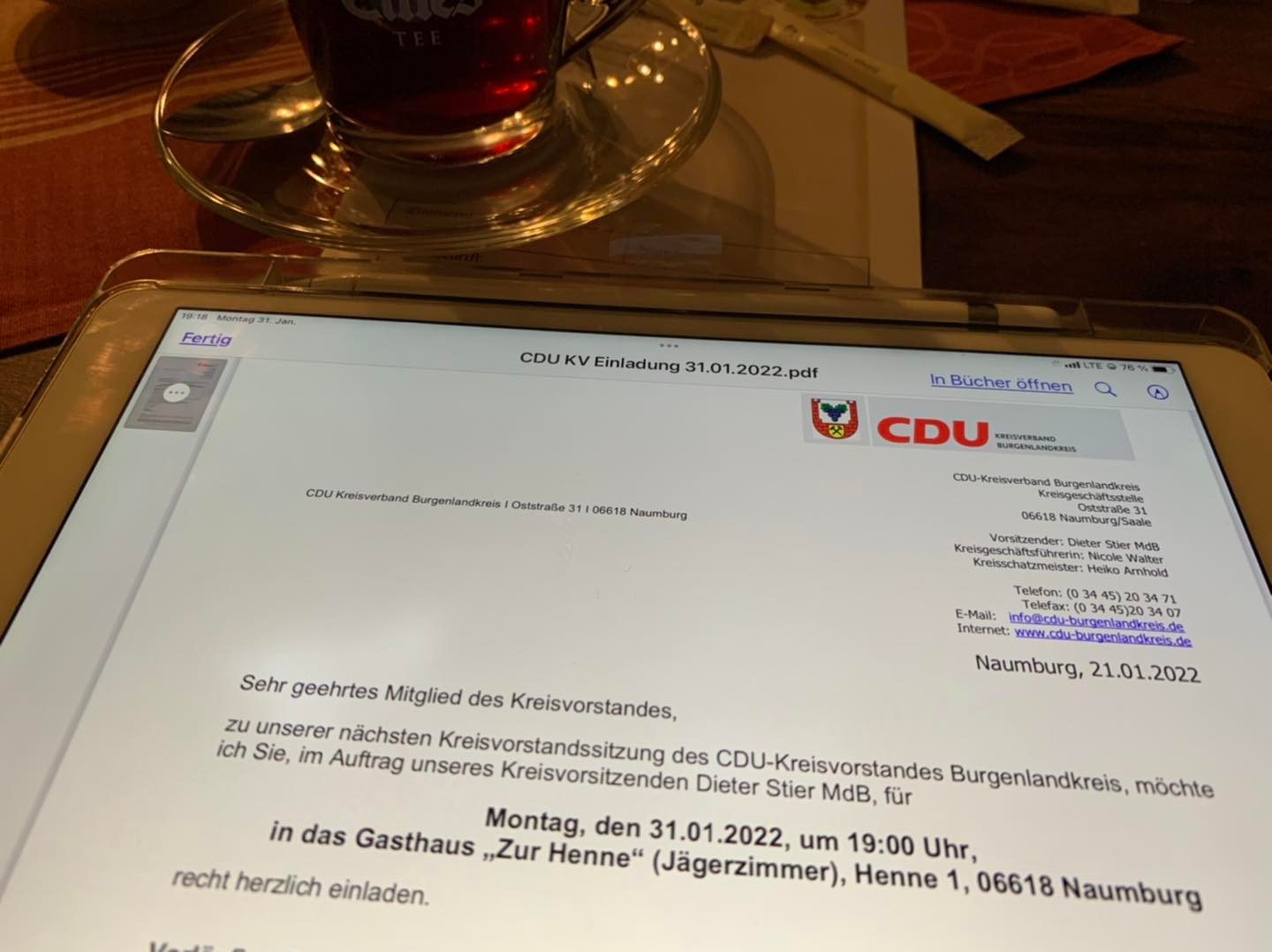 Der Montag startete mit meiner SIMON WERBUNG Team-Besprechung und war am Vormittag mit etlichen Einzelgesprächen in meinem Büro gefüllt. Dann ging es auf den Kugelberg zum Besuch der Familie Nisius. Danach führte mich mein Weg zum geschäftsführenden Kreisvorstand der CDU Burgenlandkreis dem nahtlos der digitale Landesvorstand der CDU Sachsen-Anhalt folgte und danach die Kreisvorstandssitzung in der Gasthaus & Hotel „Zur Henne“ in Naumburg/Saale. Am Dienstag durfte ich die engagierte Ortsbürgermeisterin von Prittitz bei mir begrüßen. Sie informierte mich über die Pläne in „ihrem“ Ort. Im Anschluss folgten jede Menge Telefonate mit Behörden und Verantwortlichen, um eine Lösung für einen in Not geratenen Bürger in meinem Wahlkreis zu finden. Herzlichen Dank an alle, dass es letztendlich zu einer guten Hilfe-Lösung gekommen ist. Am Nachmittag besuchte ich die Firma Gese. Geschäftsführer Mike Suske informierte mich über bald startende Projekte, die für unsere Region eine echte Bereicherung sein werden. Gern unterstütze ich die Aktivitäten des regional verwurzelten Unternehmens und informiere alsbald über die erfreulichen Neuigkeiten. Am Abend traf sich der Verwaltungsrat der AWSAS mit einer Fülle von Themen. An dieser Stelle danke ich dem Team der AWSAS und der EGSAS für die verlässliche Arbeit und das ausgewogene sowie beherzte Angehen von neuen Herausforderungen.